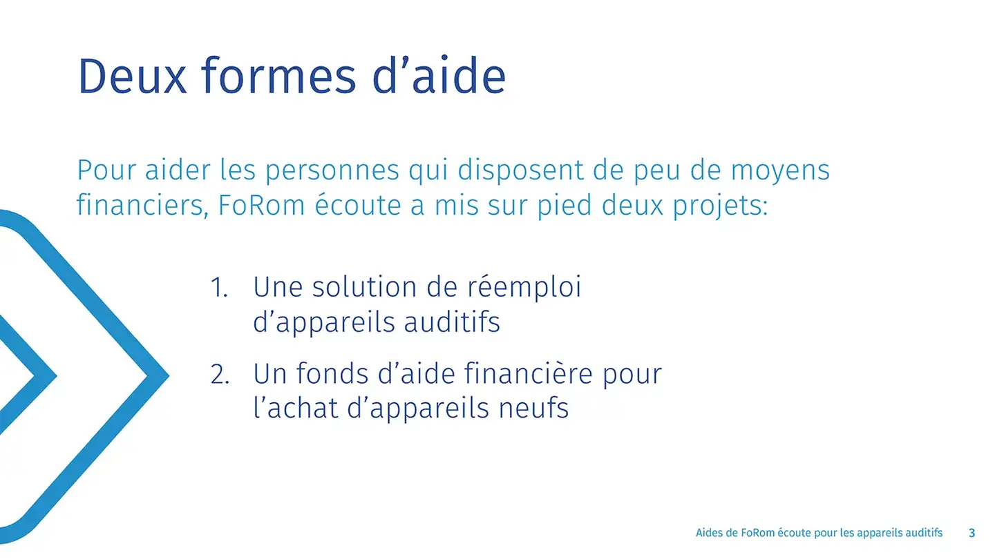 Ainsi, grâce à des appels aux dons assidus et à la grande générosité de ses donateurs, FoRom écoute a été en mesure de constituer un fonds d’aide financière directe destiné à permettre aux personnes malentendantes de s’équipe d’appareils auditifs, quels que soient leurs moyens financiers. Pour plus d’infos : Aides de FoRom écoute pour l'accès à des appareils auditifs.